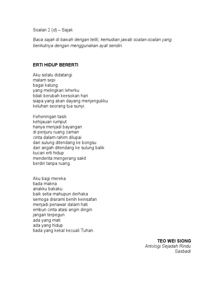 ERTI HIDUP BERERTI Aku selalu didatangi Malam sepi Bagai kalung Yang melingkari leherku Tidak berubah keesokan hari Siapa yang akan menjengukku. Nilai dan Pengajaran Komsas BM Tingkatan 5. Soalan 2d Sajak Baca sajak di bawah ini dengan teliti kemudian jawab soalan-soalan yang berikutnya dengan menggunakan ayat anda sendiri.